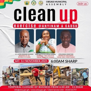 The Obuasi Municipal Clean Up exercise for the month of November 2025 is coming up at Anyinam and Gausu Electoral Areas. All are invited to partake this important exercise.